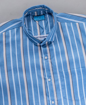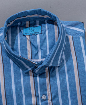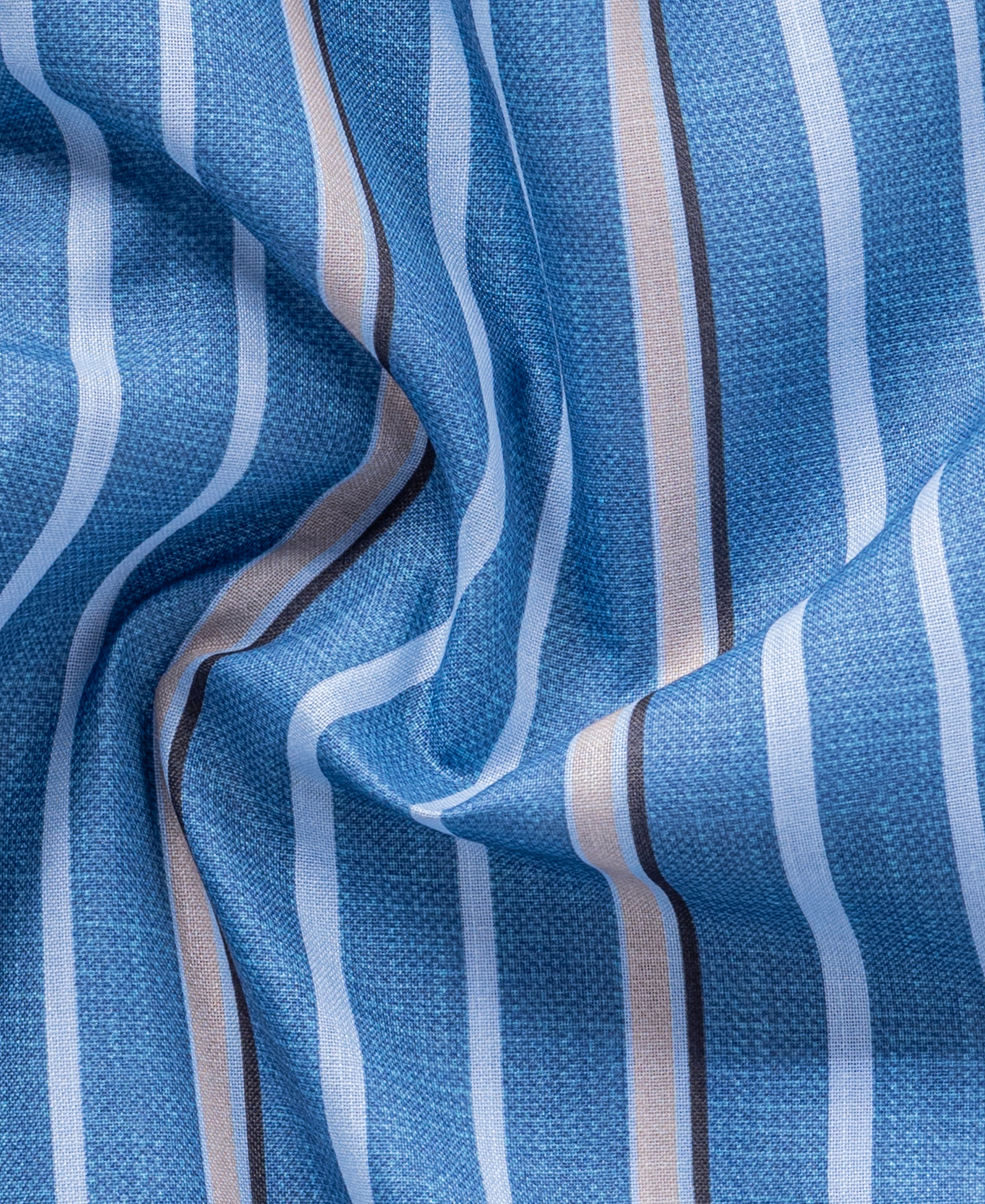 Lightweight cotton shirt with blue, white, and beige vertical stripes for a modern classic look.