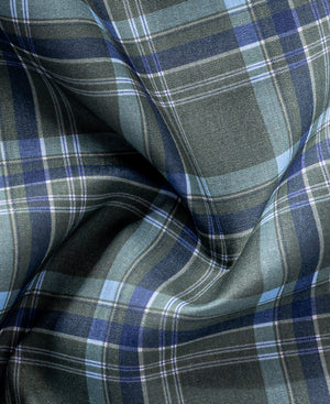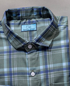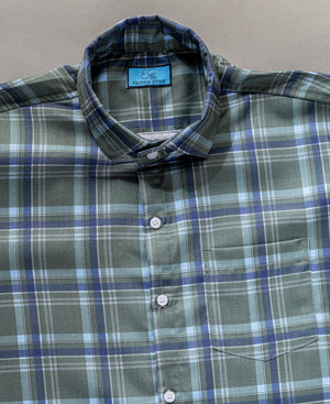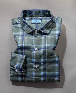 This olive green checked cotton shirt features a classic pattern with full sleeves and a chest pocket, offering a smart yet casual look for everyday wear.