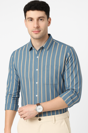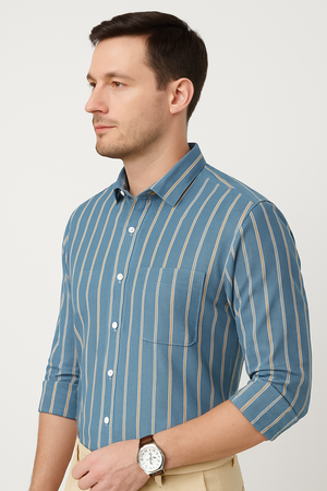 Blue Cotton Striped Shirt for Men with Long Sleeves