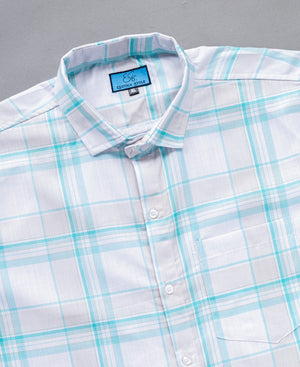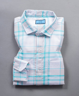 Crafted from breathable and lightweight cotton fabric, Featuring a refreshing white base with subtle aqua blue checks, it blends modern style with a relaxed vibe—perfect for casual outings or weekend brunches.