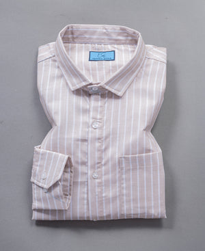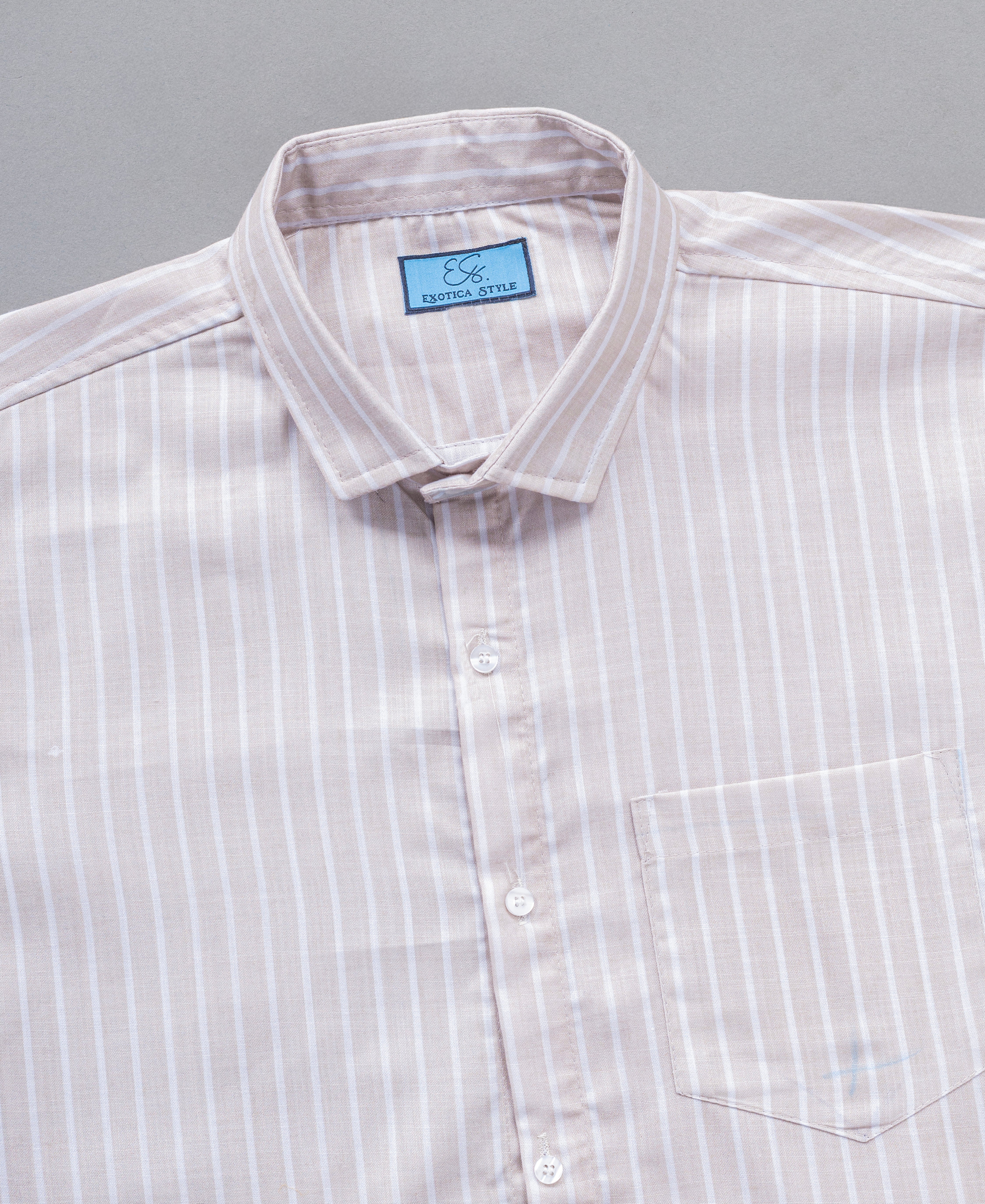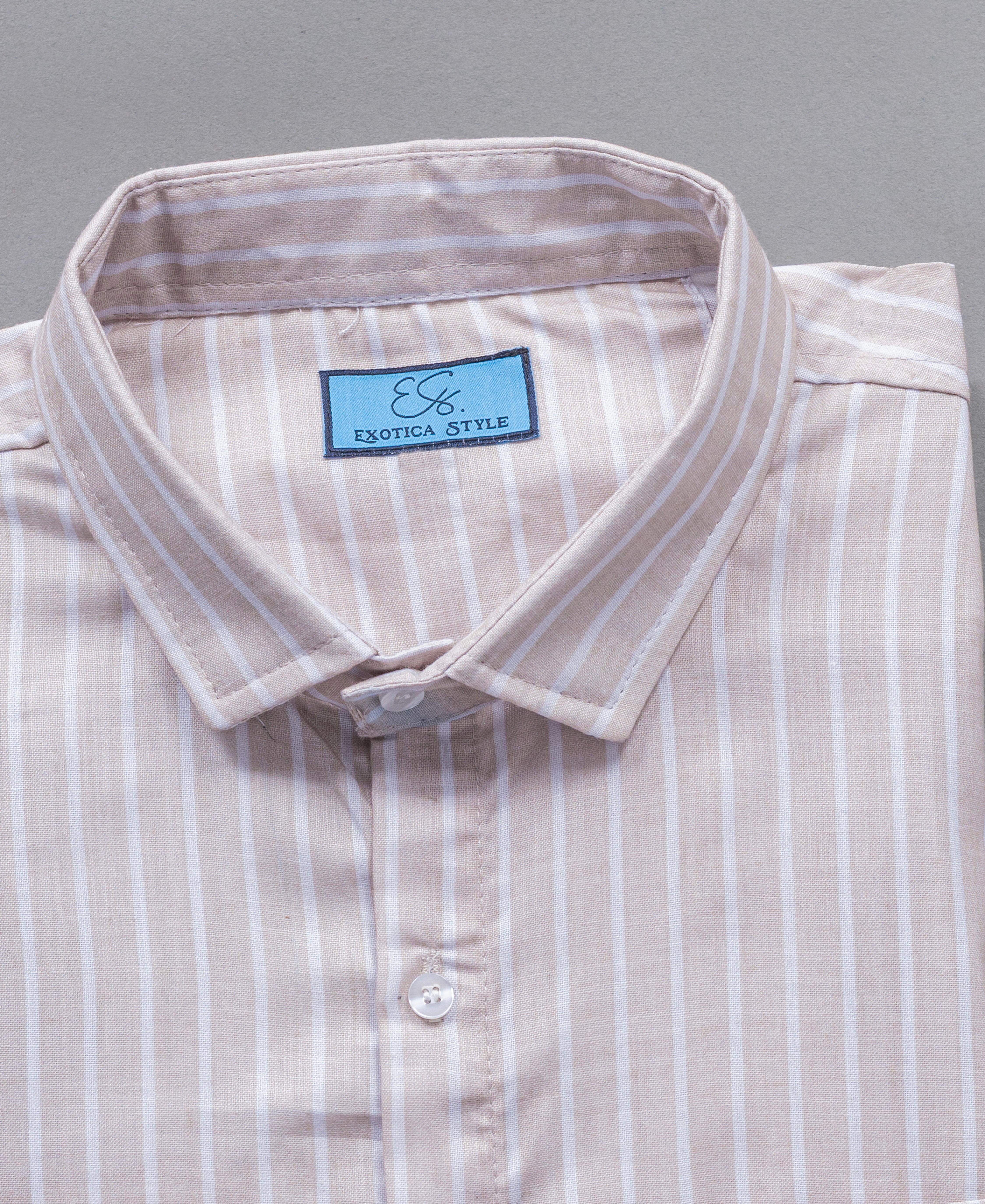 Stylish beige cotton shirt with white vertical stripes, perfect for casual and semi-formal looks.